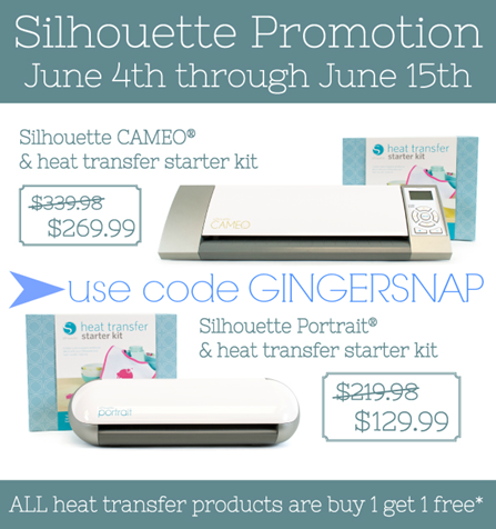 Hi there! Just popping in to remind you about the Silhouette Heat Transfer Promotions going on right now! You still have a few more days to snag a sweet deal on a Silhouette Cameo or Portrait, & all of their heat transfer material is buy one get one free. Yay! So if you already own a Silhouette now is the time to stock up on that! :) You’ll need to go here & use the code GINGERSNAP to take advantage of these ah-mazing deals. {All the details are at the bottom of this post.}