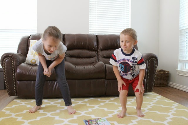 On one of the red cards it said you had to shuffle from side to side. {Of course, both of my kiddos insisted on doing all of the red cards together no matter who landed on red.} They laughed at each other, & they had the best time shuffling across the room together! ha! ;)