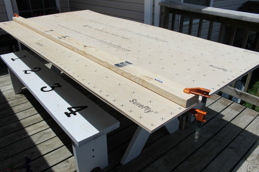 There are several ways to cut your planks. The easiest way is to have your home improvement store cut them for you or you can to what we did, cut the planks yourself. After cutting our own planks, I would recommend having the professionals cut them for you. It can get a little hard to cut super straight lines on such a long stretch of board. Let me show you how we did it just in case you want to try this yourself. It is totally doable, just a little bit tricky. You will also need a big stable area to work on if you cut your planks yourself. We used some clamps & a 2x4 to secure our birch sureply sheet to a table. Notice we have both sheets of birch sureply on the table. We will be cutting two planks at a time. The 2x4 also acts as a guide as you cut, so make sure it is nice & straight before you clamp it on. Your board needs to overhang on the side you will be cutting.